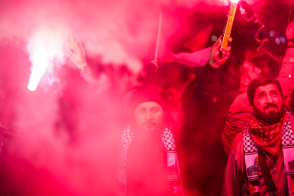 İsrail’in Gazze saldırılarının 2. yılında, İstanbul’daki İsrail Konsolosluğu önünde toplanıldı. İsrail aleyhine slogan atan gruptakiler, “Hamas’a selam, direnişe devam” yazılı döviz taşıdı.